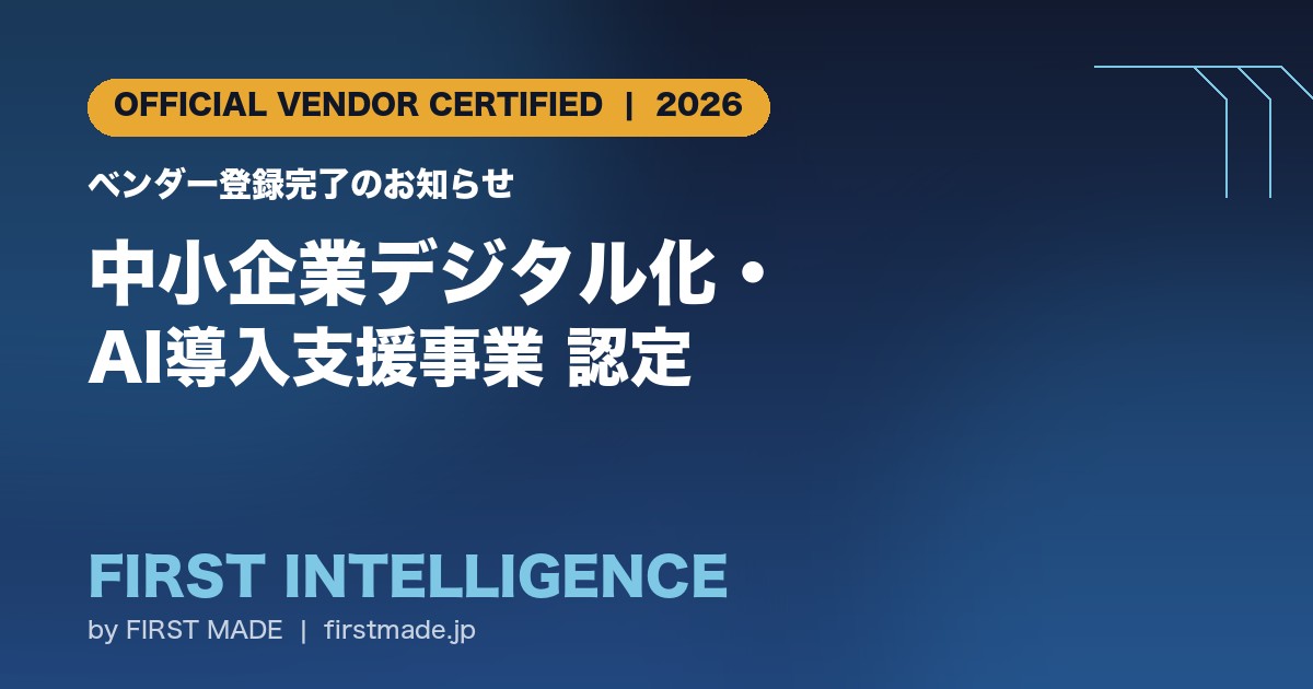 このたび、株式会社FIRST MADEが提供するAIエージェントサービス「FIRST INTELLIGENCE」が、経済産業省・中小企業庁が所管する「中小企業デジタル化・AI導入支援事業」(旧・IT導入補助金)の正式ベンダーとして登録されました。