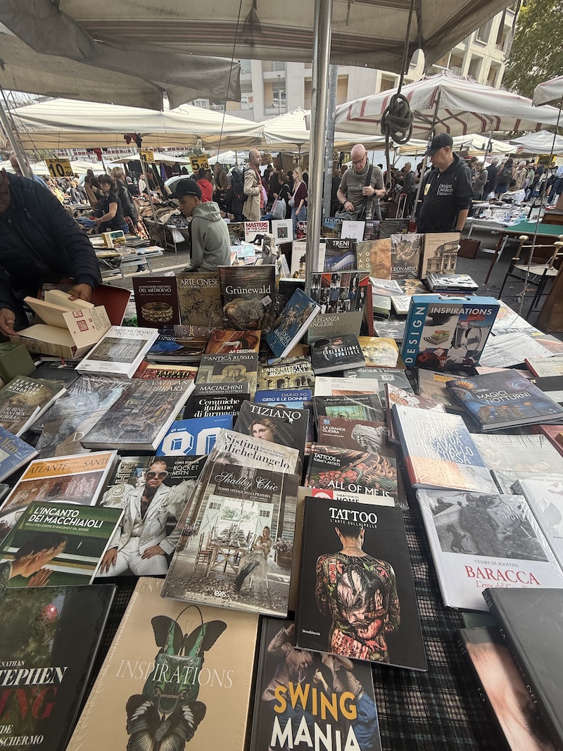 さらに、その横には美術書やタトゥーのデザイン、歴史的な建築の記録を記した古本たちが山積みになっています。 「ここにあるのは、誰かの人生の一部だったものだ。」
