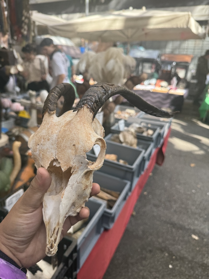 それは、見事な角を持った羊の頭蓋骨です。剥き出しの骨が放つ、荒々しくも潔い造形美。死してなお失われないその圧倒的な存在感(メメント・モリ)を前に、自分は思わずシャッターを切りました。