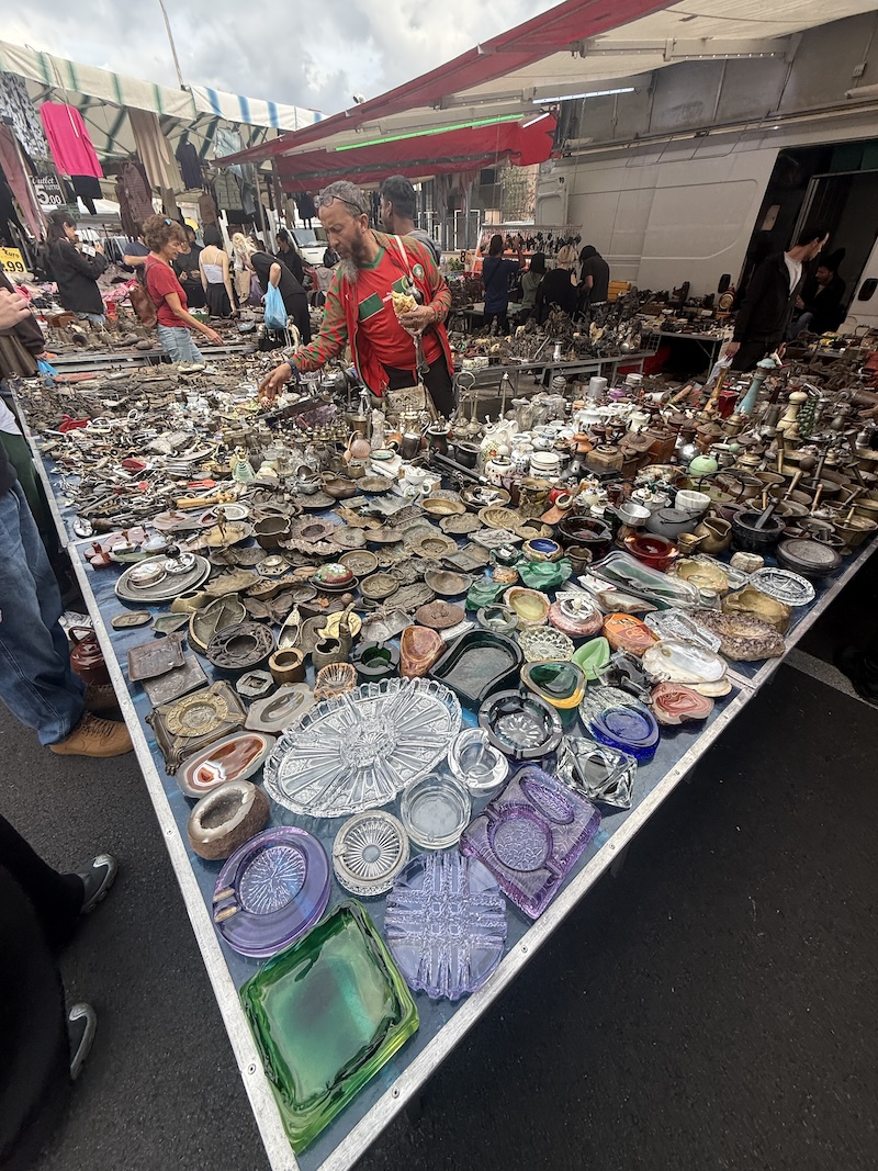 隣のテーブルに目を移すと、今度は色鮮やかなガラス細工や灰皿、名もなき職人が手がけたトレイが太陽の光を浴びて輝いていました。