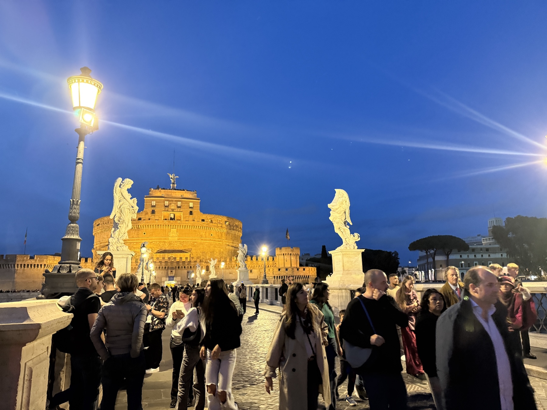 人生2回目の訪問でしたが、夜の闇に浮かび上がる黄金色の城塞、そして橋の上に並ぶ天使たちの彫像。