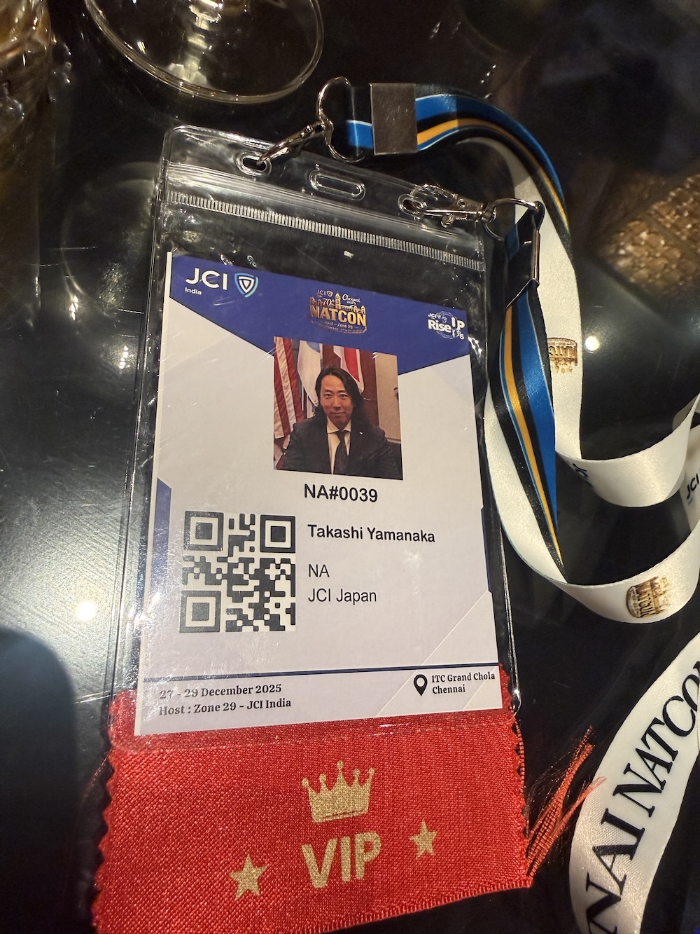Takashi Yamanaka、JCI Japan。首からぶら下げた瞬間、自分がこの場にいることの実感が湧いてきました。赤いVIPバッジも渡されて、それを見た時は正直、少し戸惑いました。