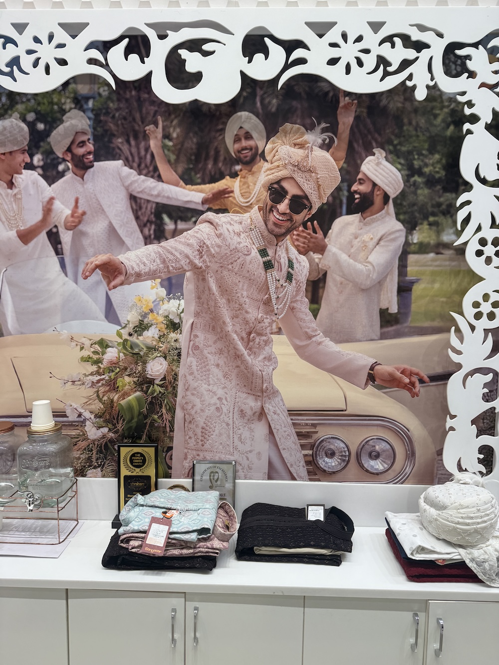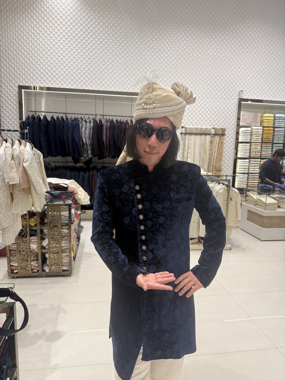 試着した時、鏡の中の自分が別人に見えました。 頭にはターバンを巻いてもらいました。ゴールドの布地に、宝石のようなブローチがついている。店員さんが器用に巻いてくれて、最後にピンで留める。サングラスをかけてポーズを取ったら、周りのスタッフが笑ってくれました。