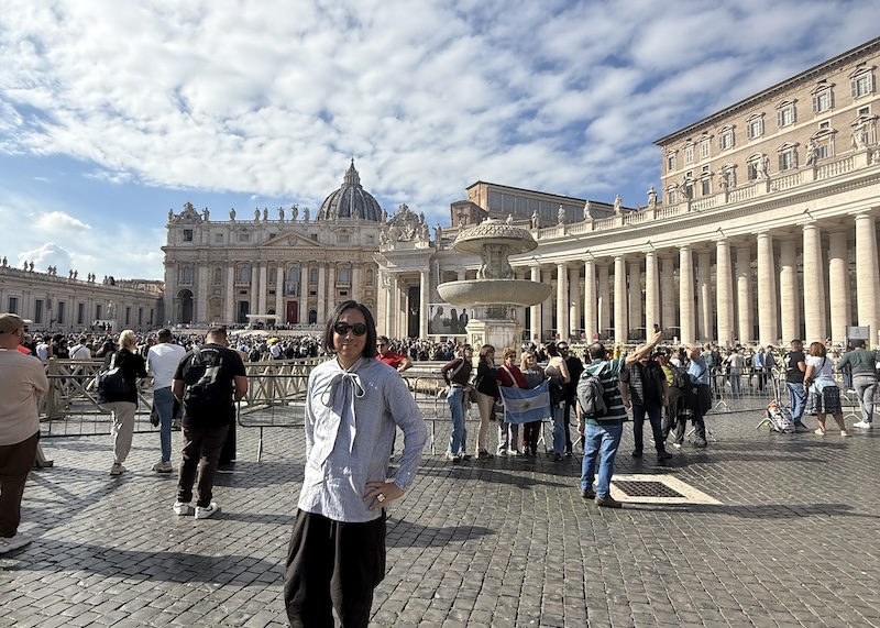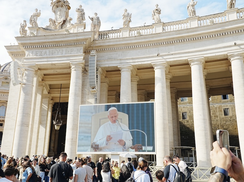 そして、この日は歴史的にも特別な空気が流れていました。広場には巨大なモニターが設置され、教皇の姿が映し出されていました。ちょうどこの頃、日本では「バチカンの指導者が交代する、あるいは重大な職務の継承が行われる」といった趣旨のニュースが駆け巡っていた時期でもありました。
