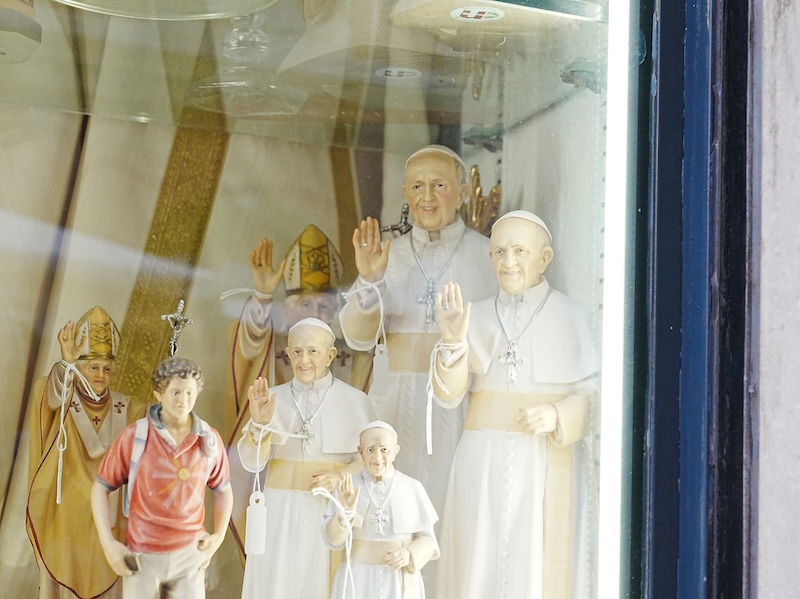 広場のショップを覗くと、歴代教皇の精巧なフィギュアが並んでいました。一見すると微笑ましくもありますが、これほどまでに一人の人物の存在が、世界中の人々の心の拠り所となっているという事実は、日本の日常にいてはなかなか実感できない「宗教の力」そのものでした。