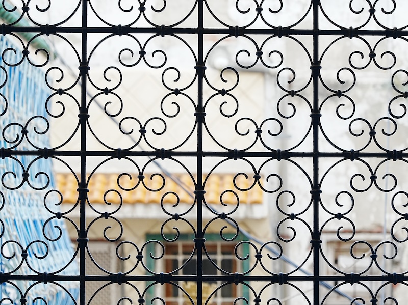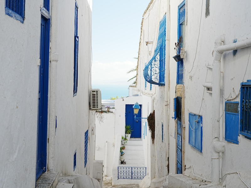 白壁に映える鮮やかなピンクのブーゲンビリアの花が、まるで計算されたデザインのように街を彩っています。 そして、複雑なアラベスク模様が施された「チュニジアン・ブルー」の扉や窓枠。