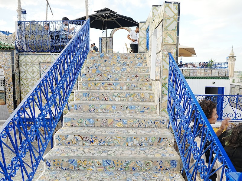 このマーケット巡りで、自分を最も感動させたのは、ある一角から登った「マーケットの屋上」でした。 迷路のような階段を抜けると、そこには視界が開けた開放的な空間が広がっていました。驚いたのは、その空間を埋め尽くす見事なタイル細工です。