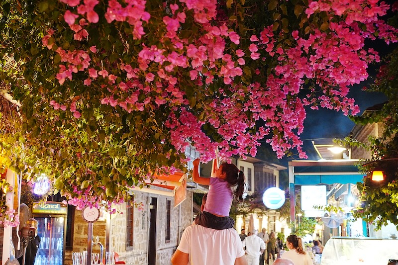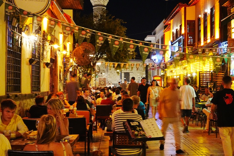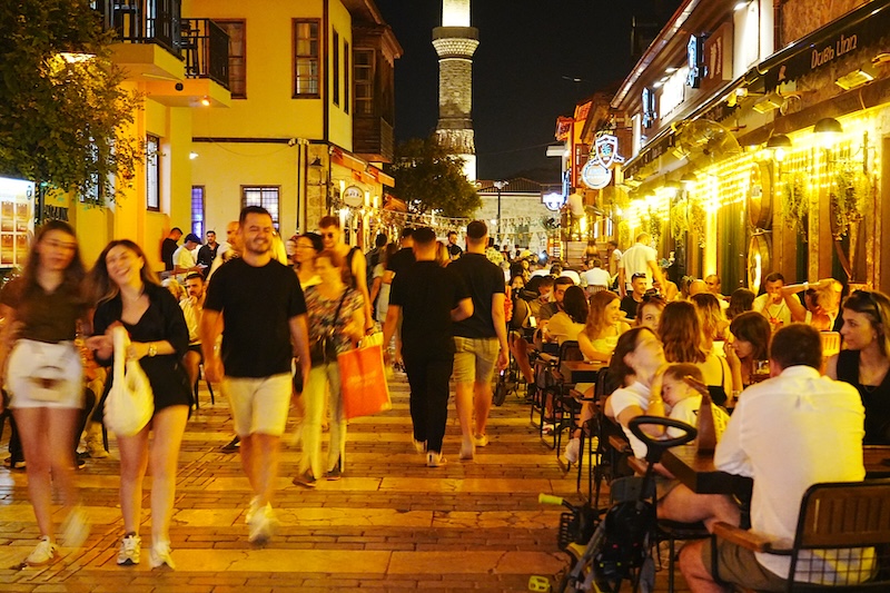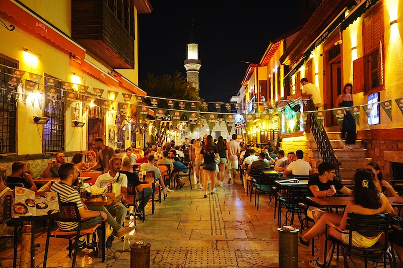 夕方になると、カレイチは昼間の静けさから一転して、きらめきに満ちた舞台へと変わります。石畳の両側に並ぶレストランやバーは一斉に灯りを灯し、黄金色のイルミネーションが通りを包み込みます。テーブルに腰掛けた旅行者や地元の人々は、ワインやエフェスビールを片手に談笑している。グラスが触れ合う音、アコーディオンの演奏、時折聞こえる笑い声。そのすべてが街の鼓動のように感じられました。