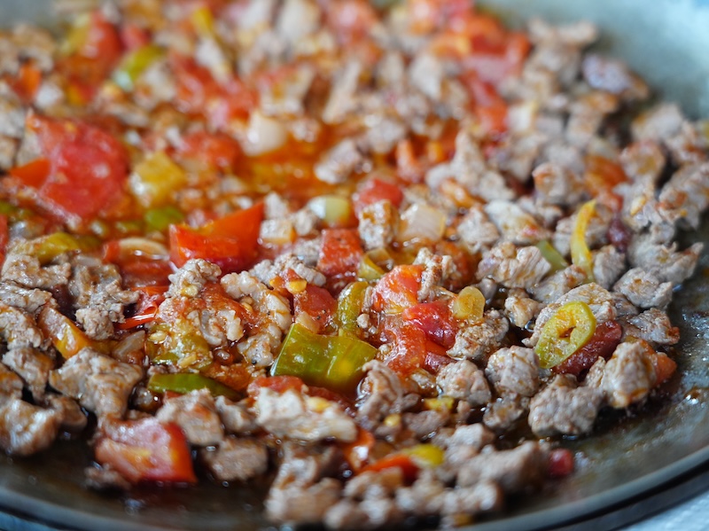 じゅうじゅうと音を立てながら、肉とトマト、ピーマンが一体となっている。