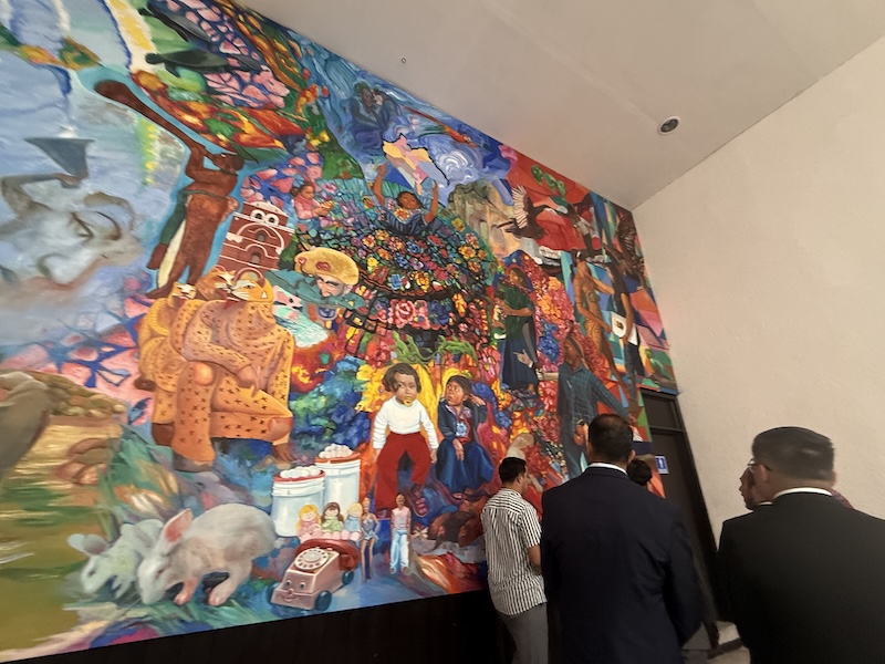 まず目を奪われたのは、壁一面に描かれた巨大な壁画でした。 それはもはや絵画という枠を超えた、魂の記録。チアパスの人々が歩んできた苦難の道、守り抜いてきた信仰、そしてこの豊かな自然。過去と現在、そして未来への祈りが、うねるような色彩の中で溶け合っている。