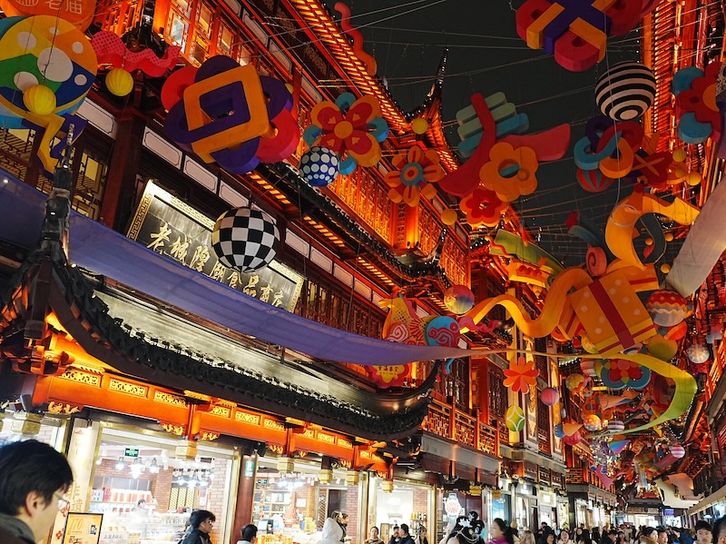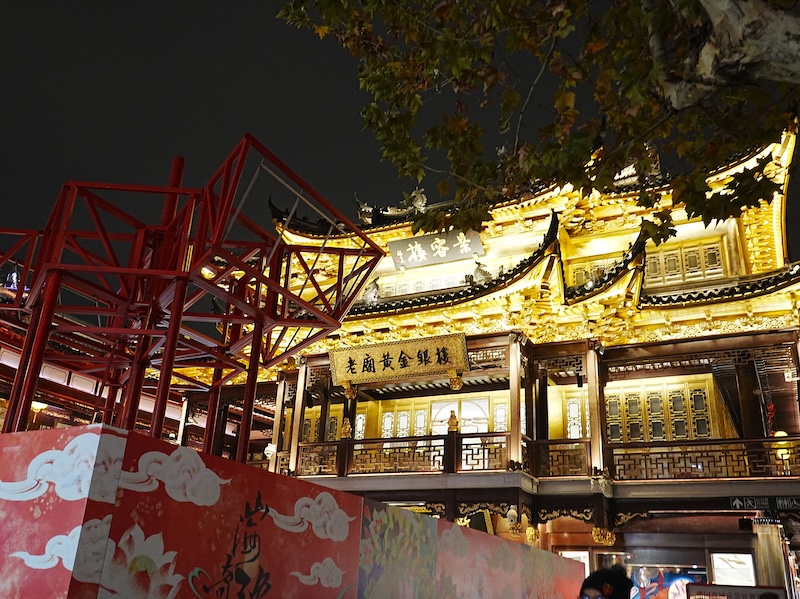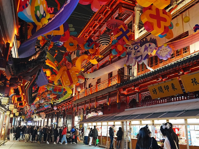 超近代的な風景に圧倒された後は、上海の伝統美を求めて「豫園(よえん)」へと向かいました。明代の庭園を中心としたこのエリアは、夜になると無数の提灯とライトアップによって、極彩色のワンダーランドへと姿を変えます。